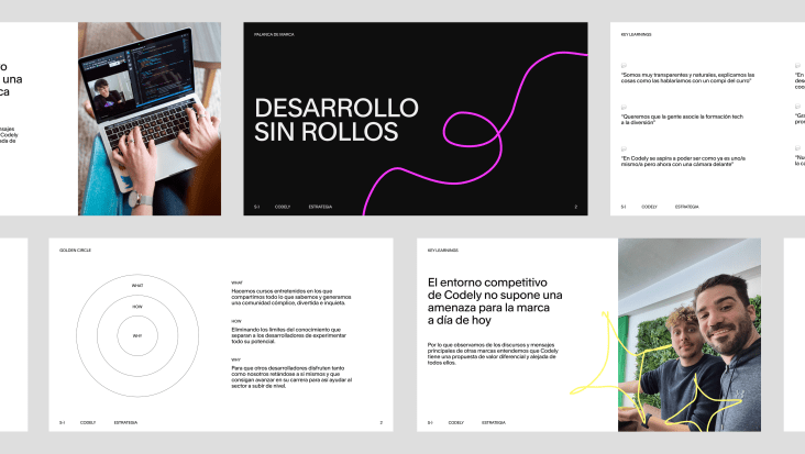 La evolución y el nuevo universo visual de Codely transforma también el lugar en el que todo empezó, su web. Comenzamos ordenando todo lo que había que comunicar, tanto a nivel del producto como de marca. Mano a mano con el equipo de Codely, identificamos sus puntos fuertes para jerarquizarlos y contarlos.